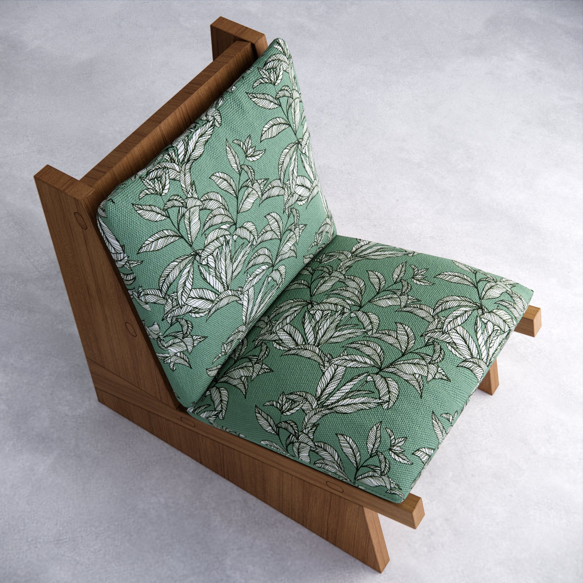 The Rimba Lounge Chair is a contemporary statement piece crafted from solid wood and paired with plush botanical-print cushions. Featuring bold geometric lines, a low-profile silhouette, and a warm natural wood finish, it offers both visual impact and exceptional comfort. Its tropical mint-green upholstery adds a fresh, modern touch, making it ideal for reading, relaxing, or elevating a stylish living space.