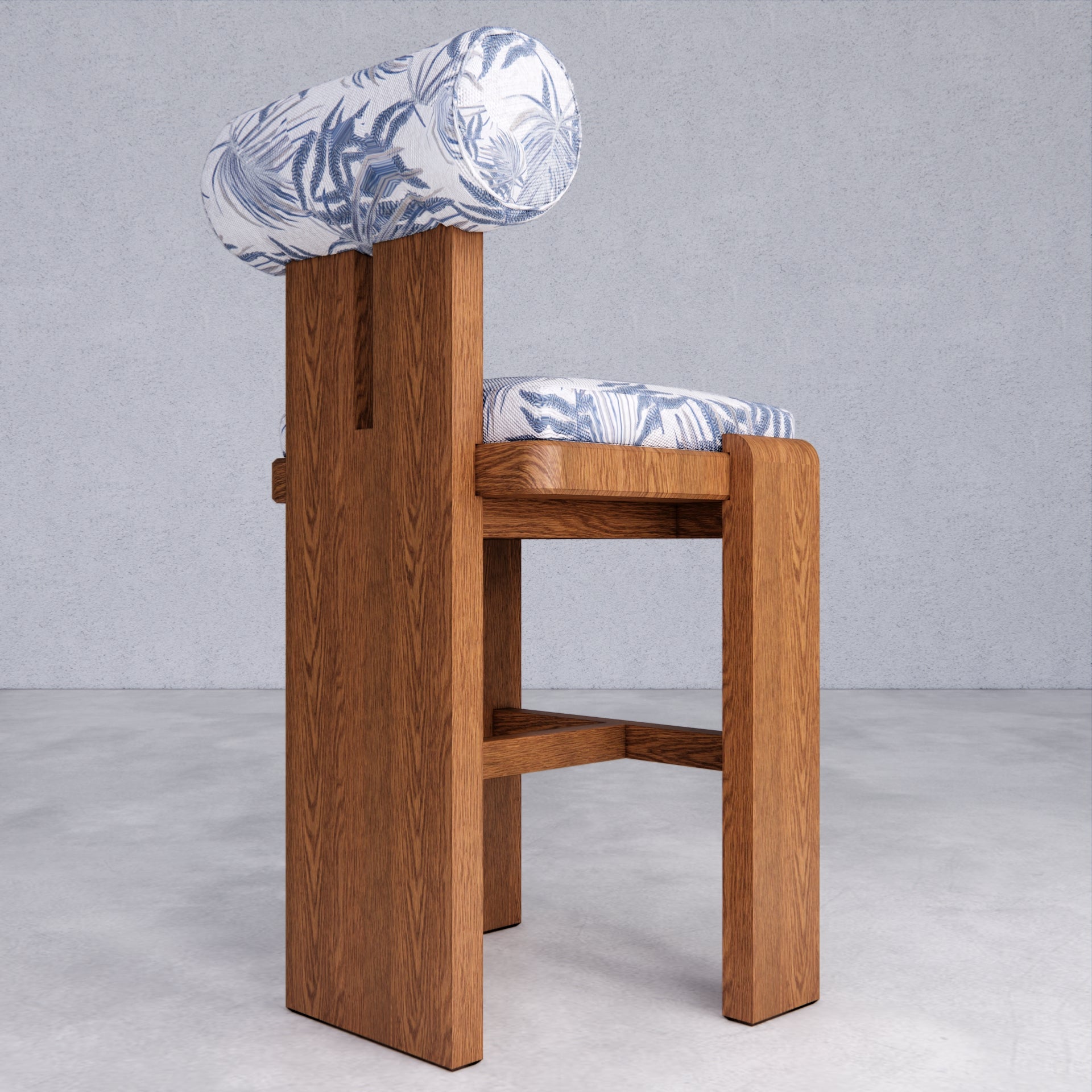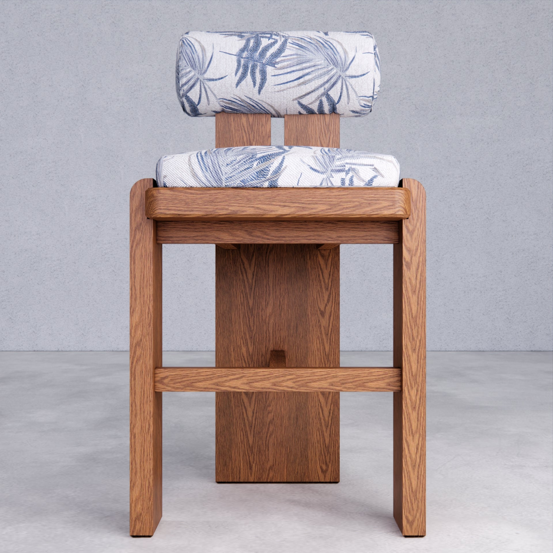 The Tropika Wooden Accent Chair offers a refined blend of minimalist design and tropical-inspired charm, featuring a solid wood frame, cylindrical bolster backrest, and a plush seat cushion wrapped in a soft leaf-pattern fabric. Designed to bring style and comfort to elevated seating areas, it combines natural warmth with contemporary character perfect for kitchen counters, casual dining spaces, or adding a refreshing accent to modern interiors.