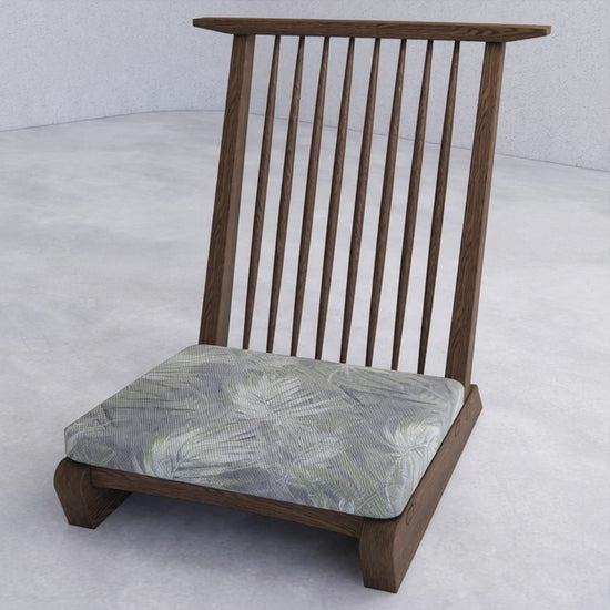 The Zenith Floor Lounge Chair is a modern take on the Japanese zaisu, featuring a solid wood frame, angled spindle backrest, and a plush botanical-print cushion. Designed for grounded, floor-level comfort, it blends natural materials with contemporary style perfect for reading, relaxing, or creating a Zen-inspired space.