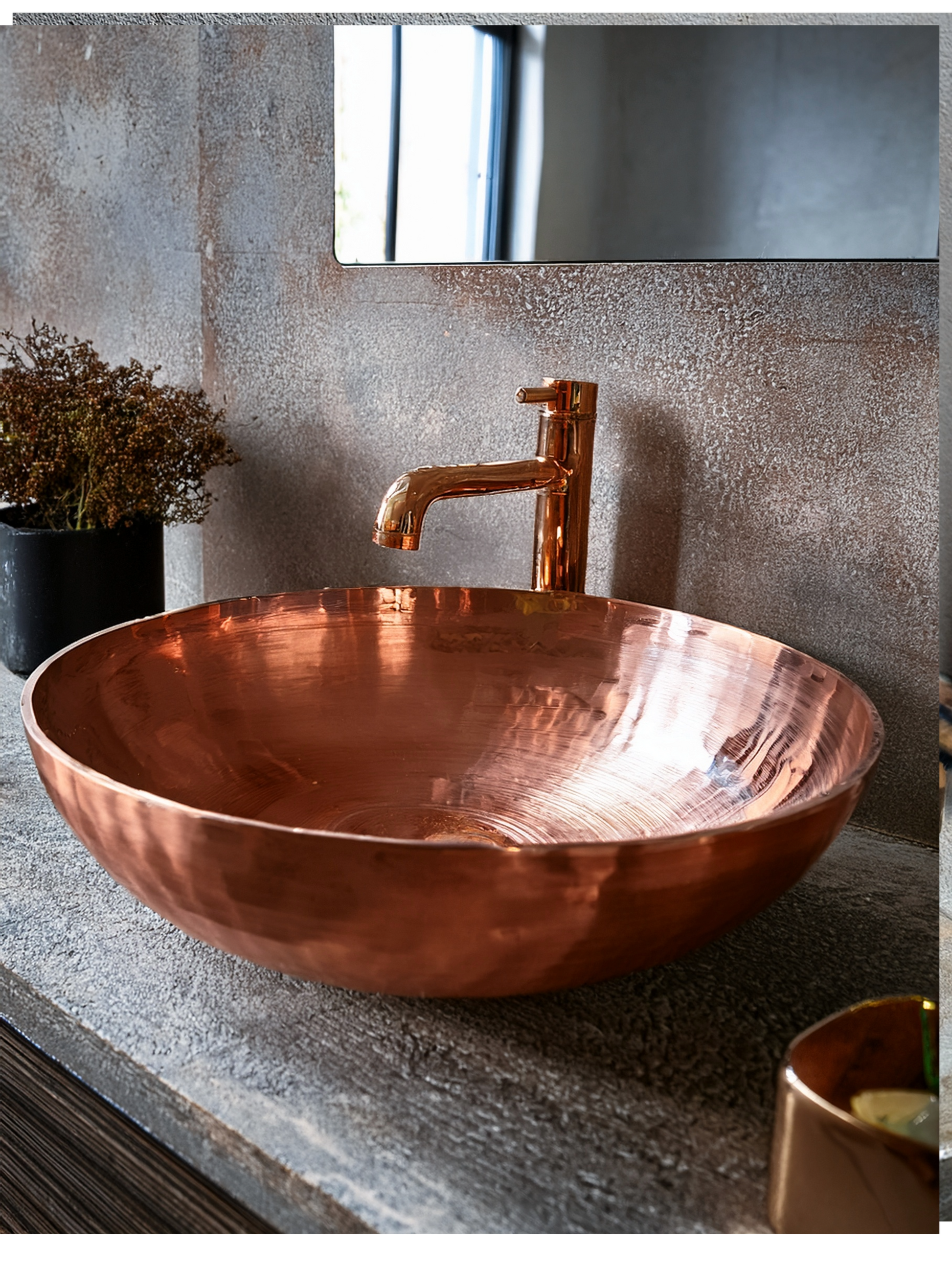 Warm, satin-copper finish that develops unique character over time