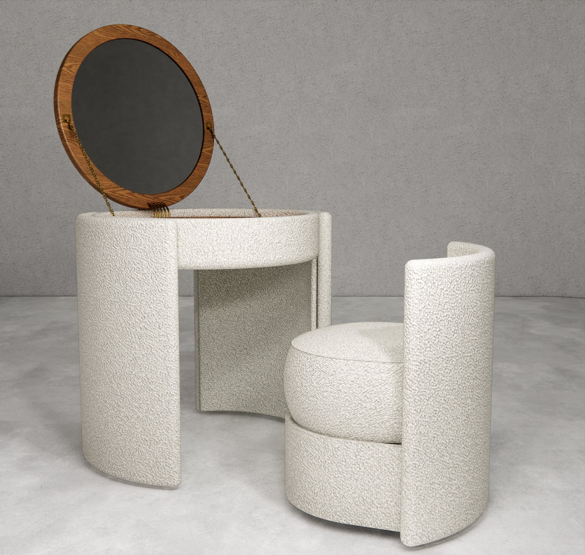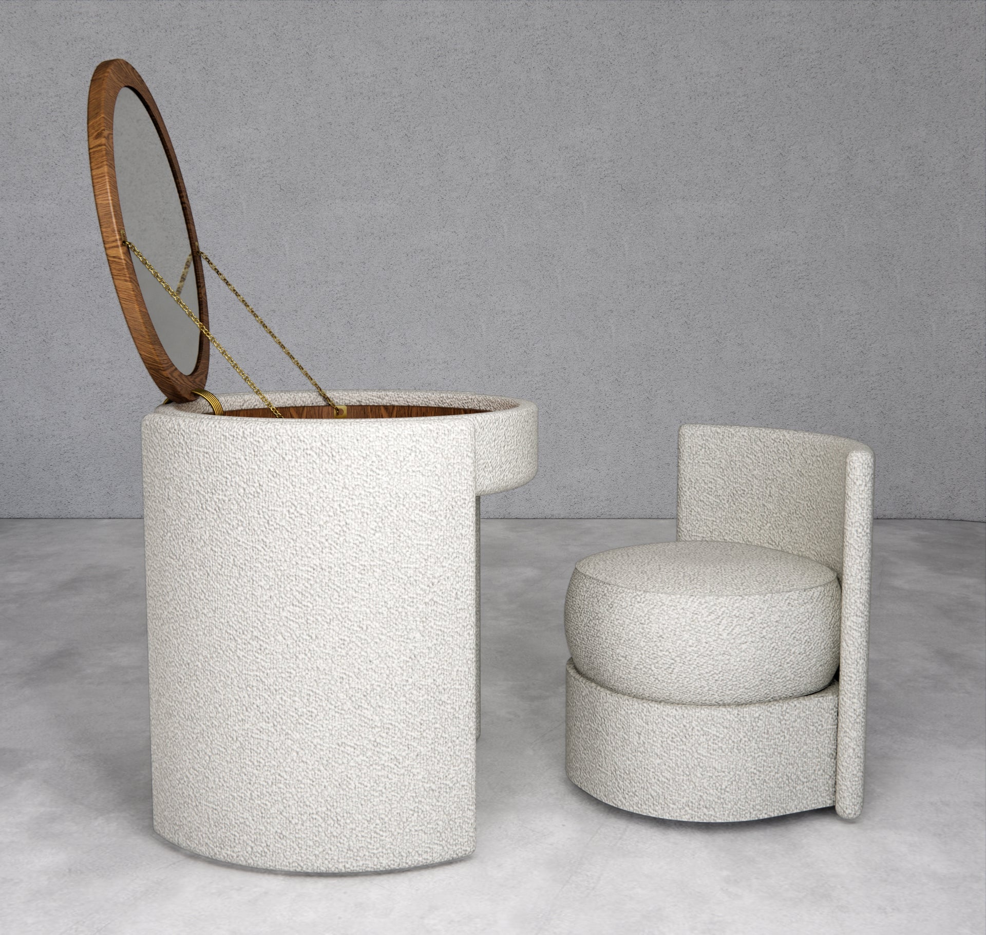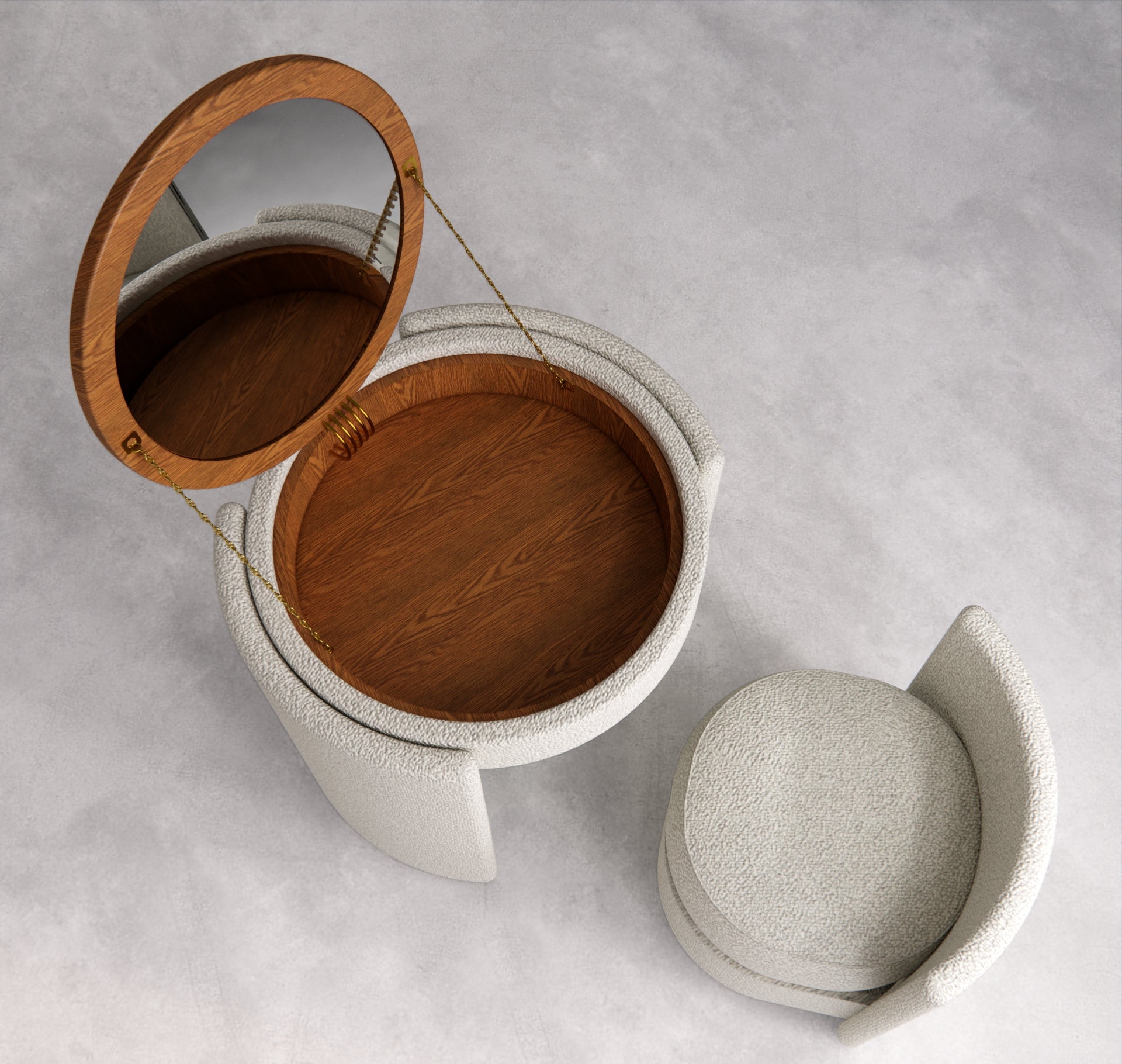 The Jolie Dresser is a refined fusion of function and sculptural design, conceived as a statement piece rather than a traditional storage unit. With its soft cylindrical form and tactile upholstered finish, Jolie introduces a sense of quiet luxury to any space. The hinged circular lid reveals a concealed interior compartment, accented by warm timber detailing and delicate gold-toned chain supports. Thoughtfully designed, Jolie transitions effortlessly between dresser, vanity, and functional art object.