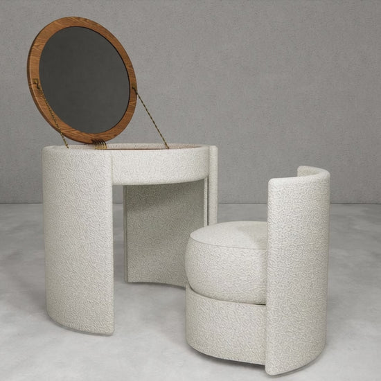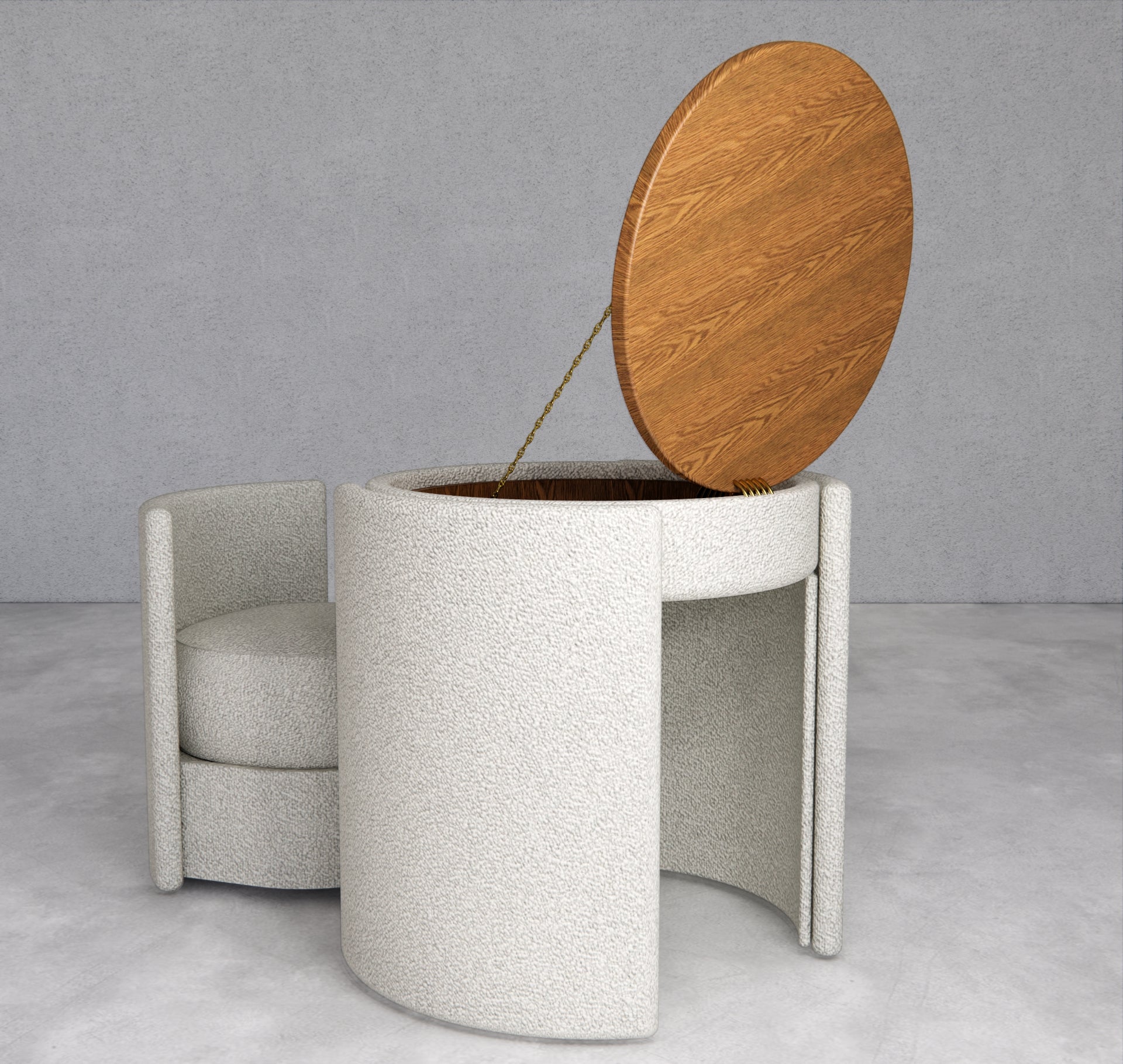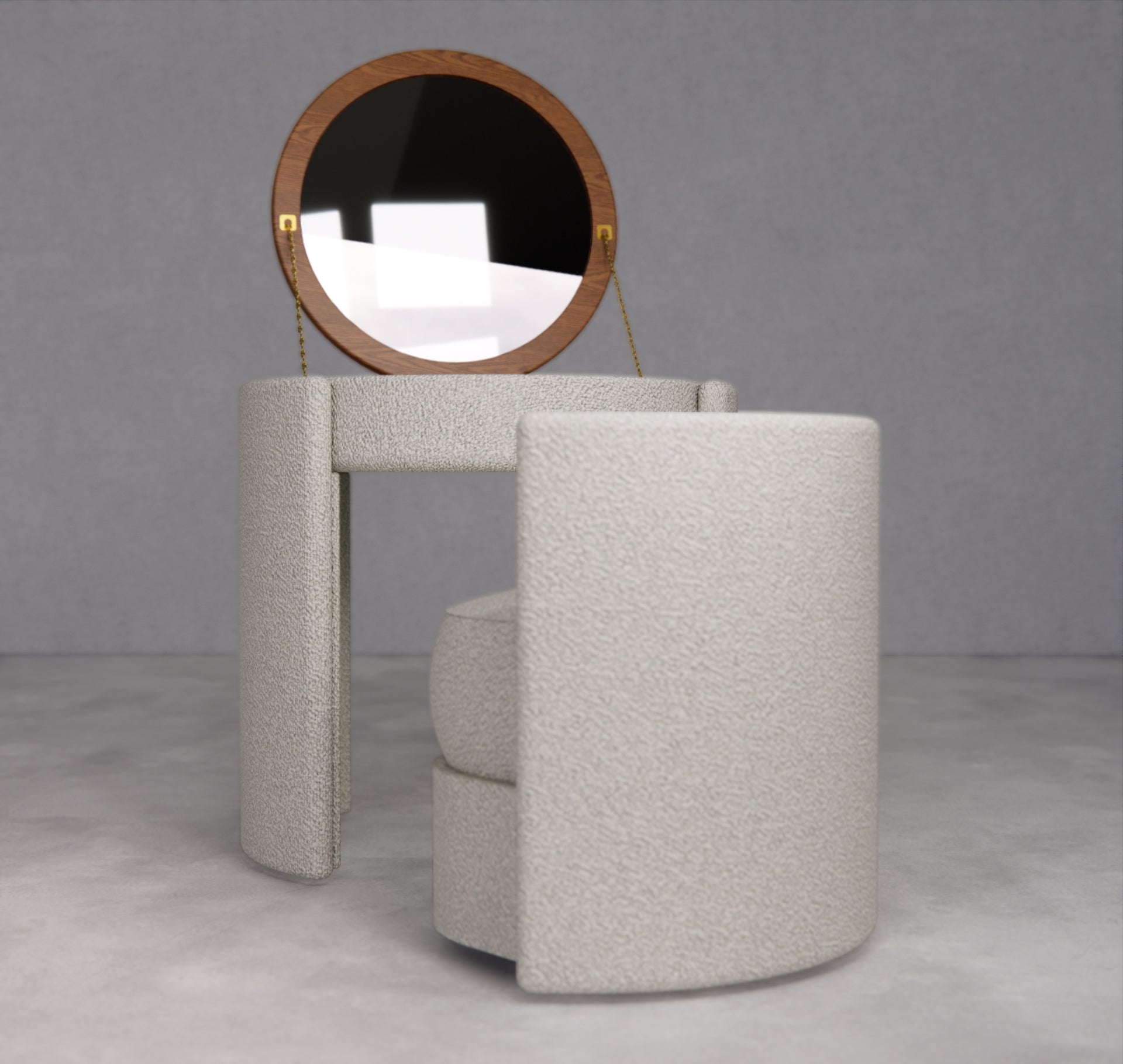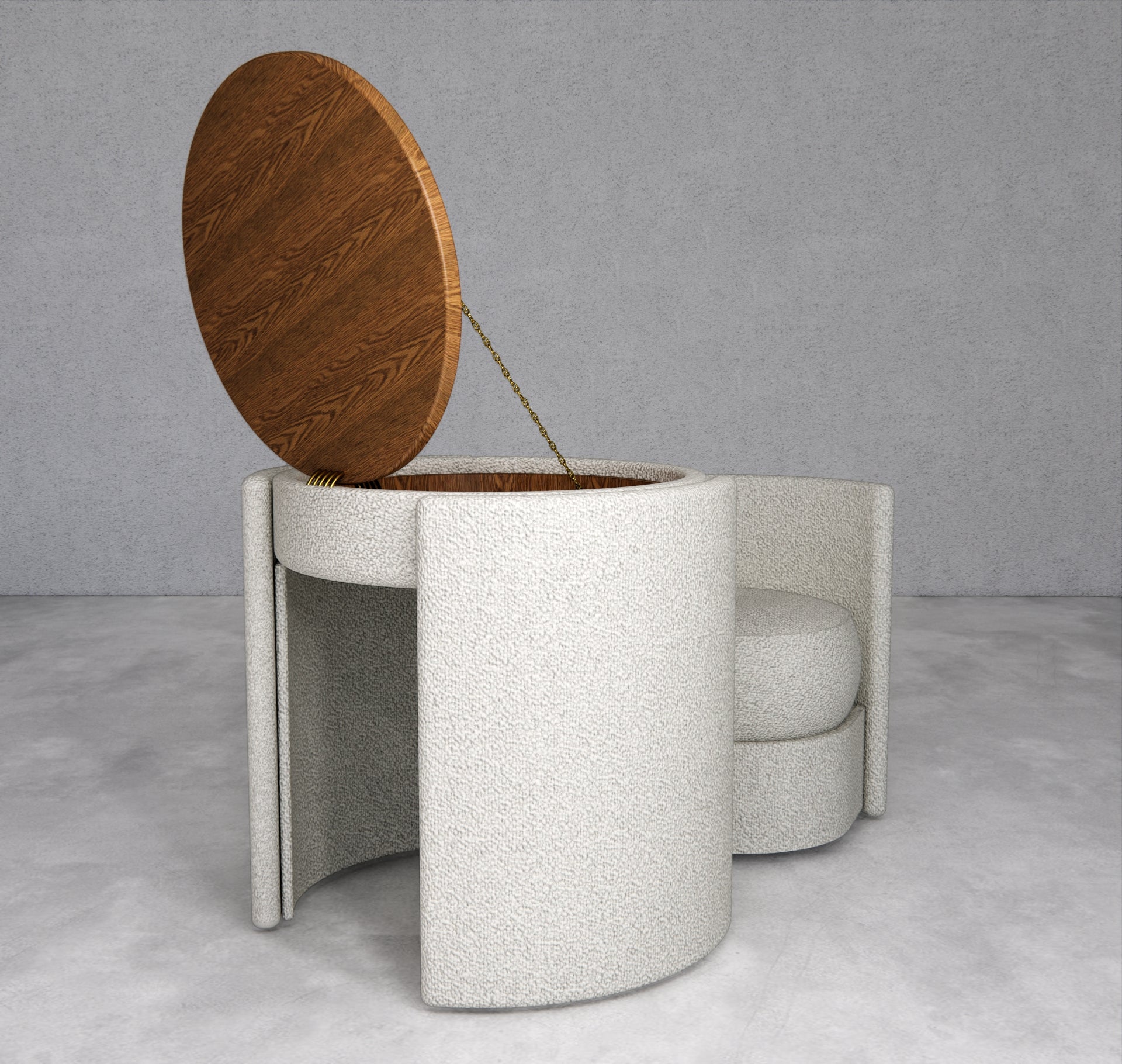 The Jolie Dresser is a refined fusion of function and sculptural design, conceived as a statement piece rather than a traditional storage unit. With its soft cylindrical form and tactile upholstered finish, Jolie introduces a sense of quiet luxury to any space. The hinged circular lid reveals a concealed interior compartment, accented by warm timber detailing and delicate gold-toned chain supports. Thoughtfully designed, Jolie transitions effortlessly between dresser, vanity, and functional art object.