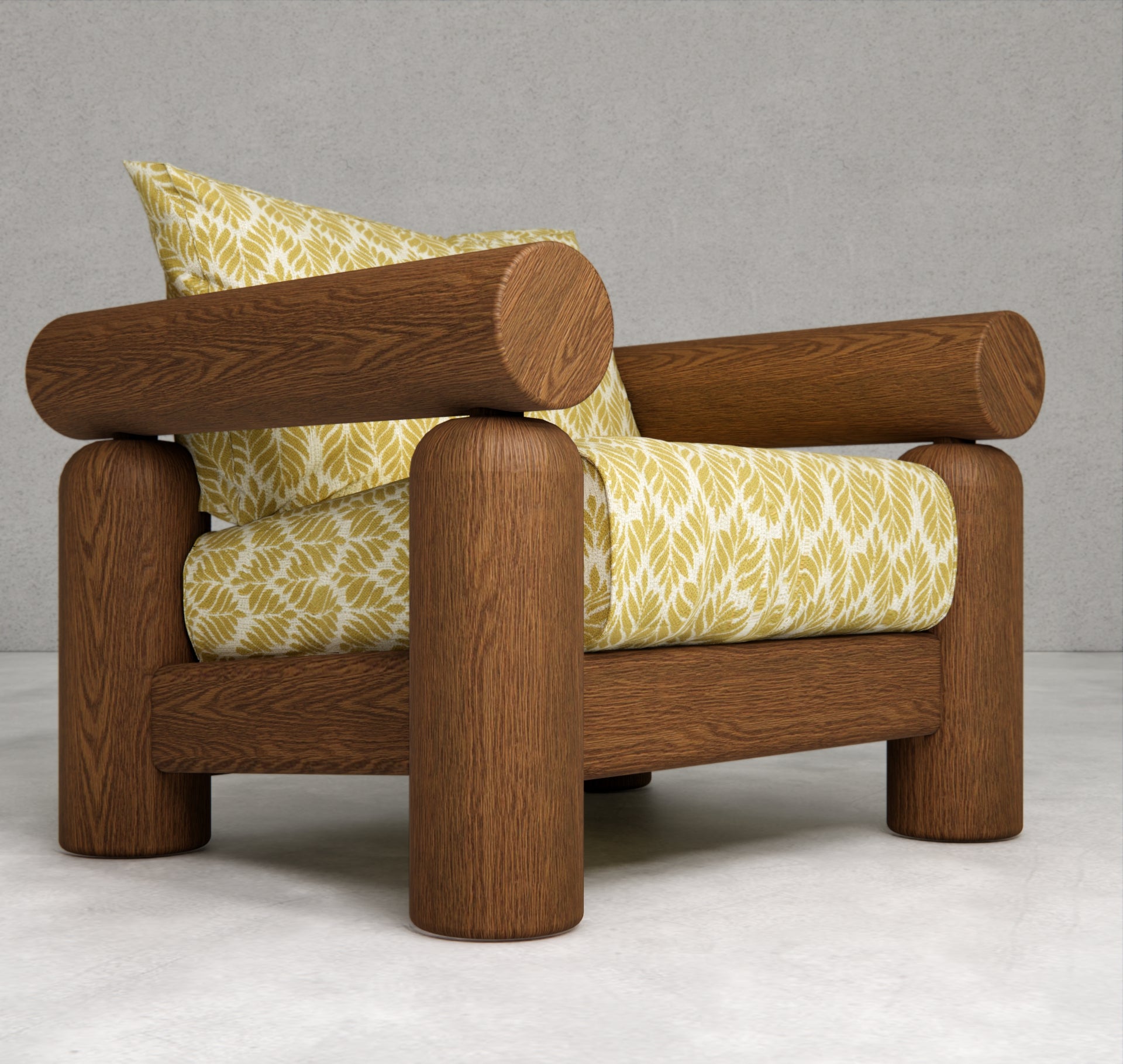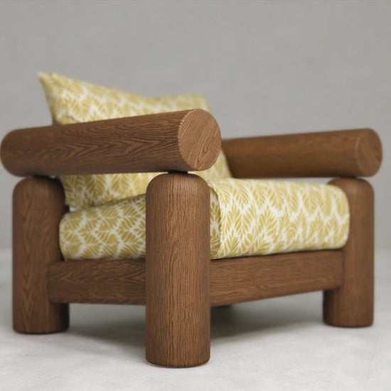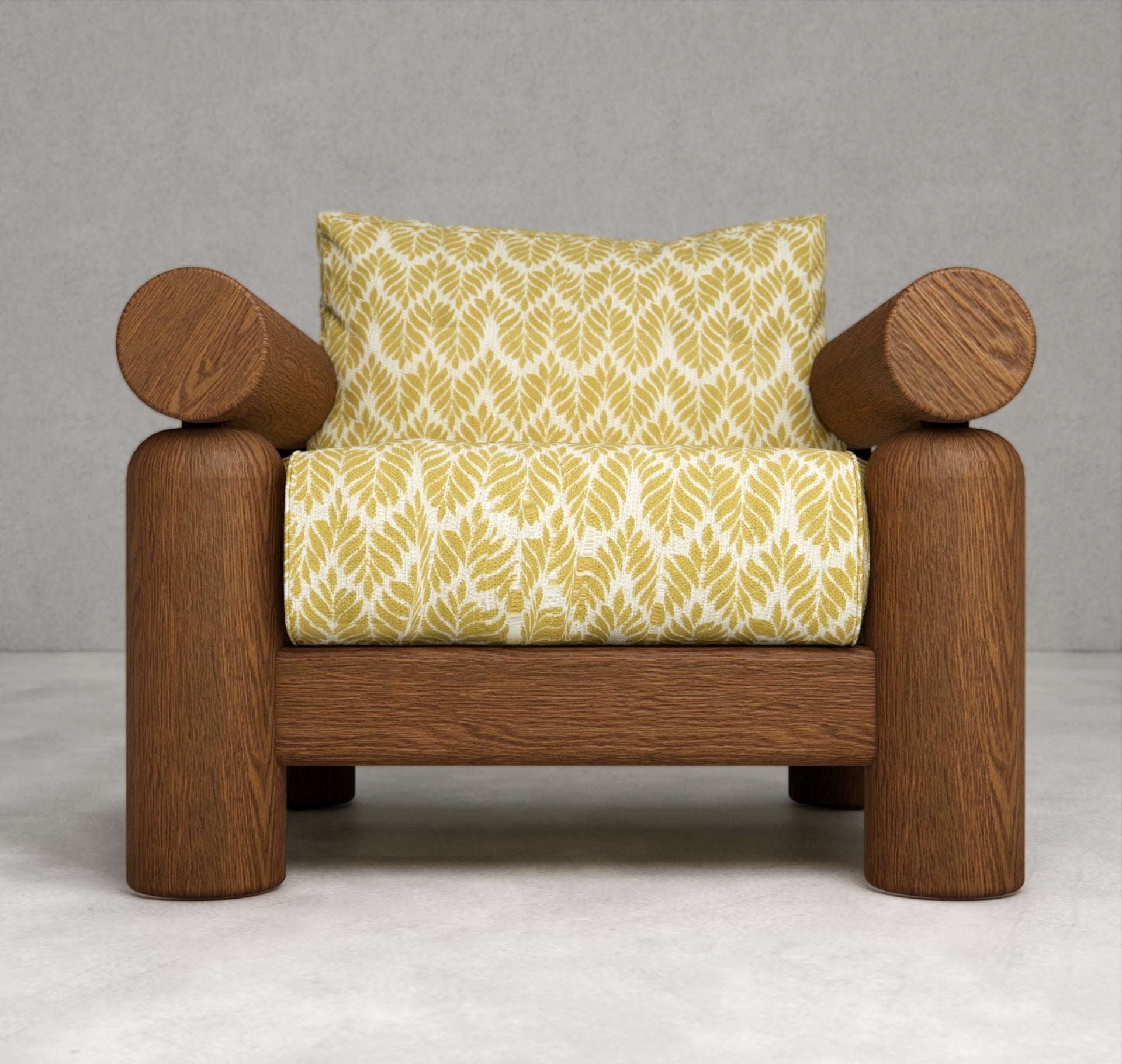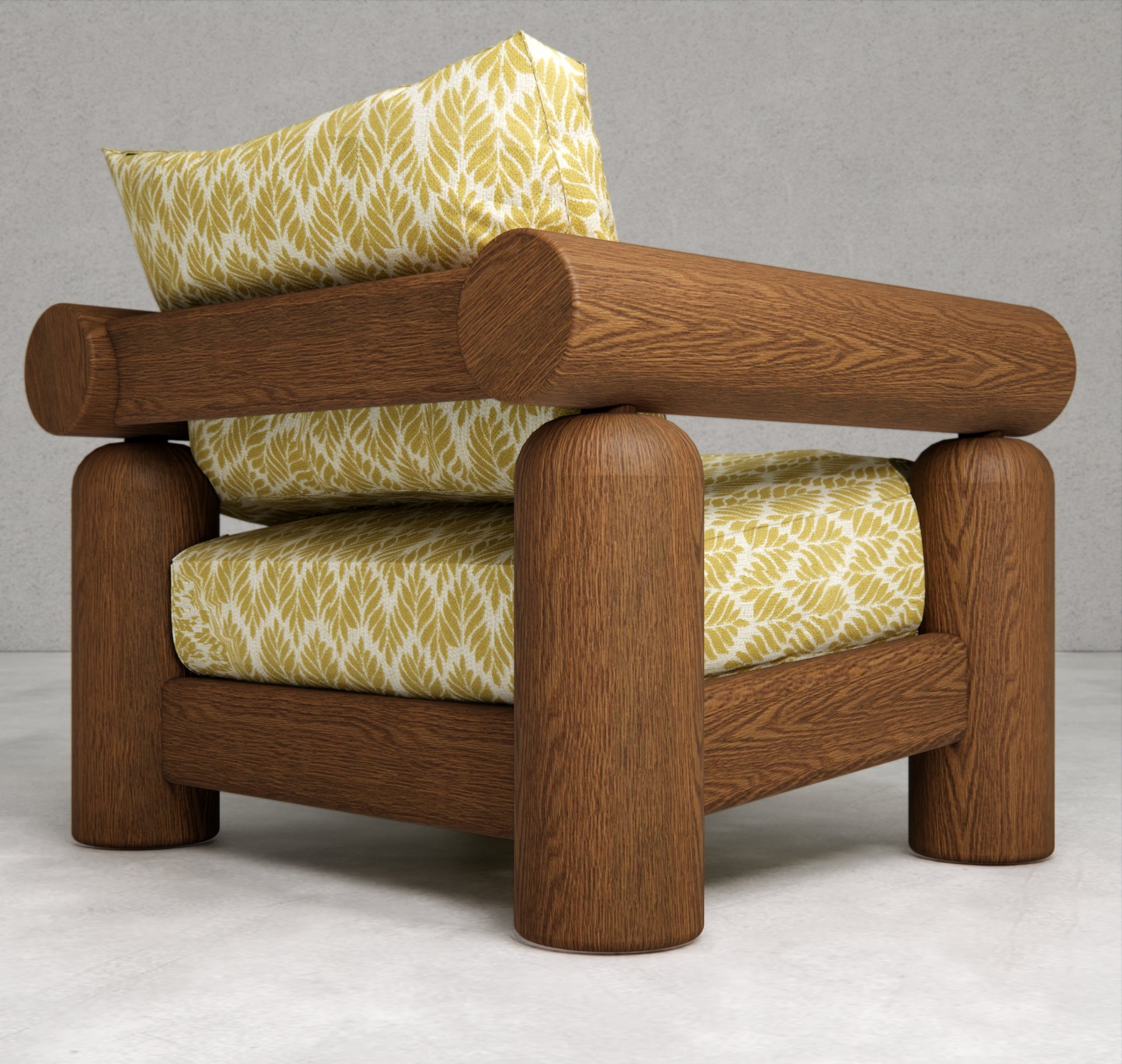 The Maple Lounge Chair is a bold celebration of form, material, and craftsmanship. Built around a solid timber frame with oversized cylindrical elements, Maple feels both sculptural and grounded. Generously cushioned and upholstered in a patterned textile, it creates a striking contrast against the warm wood structure. Designed for relaxed lounging rather than formal sitting, Maple brings personality, comfort, and unmistakable presence to any space.